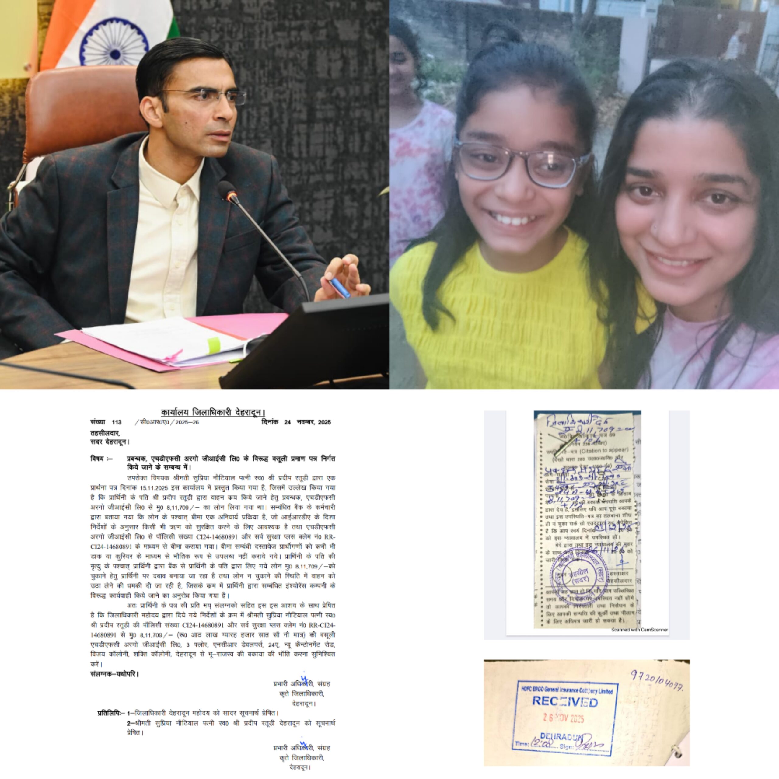विगत दिवस फरियादी सुप्रिया नौटियाल पत्नी स्व० प्रदीप रतूड़ी द्वारा एक जिलाधिकारी सविन बसंल के समक्ष 15 नवम्बर 2025 गुहार लगाई कि उनके पति प्रदीप रतूड़ी द्वारा वाहन कय किये जाने हेतु प्रबन्धक, एचडीएफसी आरगो जीआईसी लि० से मु० 8,11,709/- का ऋण लिया गया था। सम्बंधित बैंक के द्वारा बताया गया कि लोन के पश्चात् बीमा एक अनिवार्य प्रक्रिया है, जो आईआरडीए के दिशा निर्देशों के अनुसार किसी भी ऋण को सुरक्षित करने के लिए आवश्यक है तथा एचडीएफसी अरगो जीआईसी लि० से पॉलिसी संख्या सीआई 24-14680 और सर्व सुरक्षा प्लस क्लेम नं० आरआर-सीआई 24-14680891 के माध्यम से बीमा कराया गया था। बीमा सम्बंधी दस्तावेज कभी भी डाक या कुरियर के माध्यम से भौतिक रूप से उपलब्ध नहीं कराये गये थे। उनके पति की मृत्यु के पश्चात् सुप्रियाय द्वारा बैंक से अपने पति द्वारा लिए गये लोन मु0 8,11,709/- को चुकाने हेतु दबाव बनाया जा रहा है तथा लोन न चुकाने की स्थिति में वाहन को उठा लेने की धमकी दी जा रही है, जिसके लिए सुप्रिया द्वारा सम्बंधित इंश्योरेंस कम्पनी के विरूद्ध कार्यवाही किये जाने का अनुरोध जिलाधिकारी से किया गया।